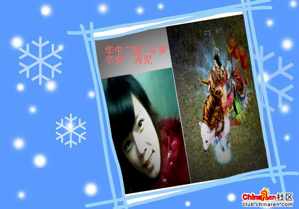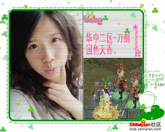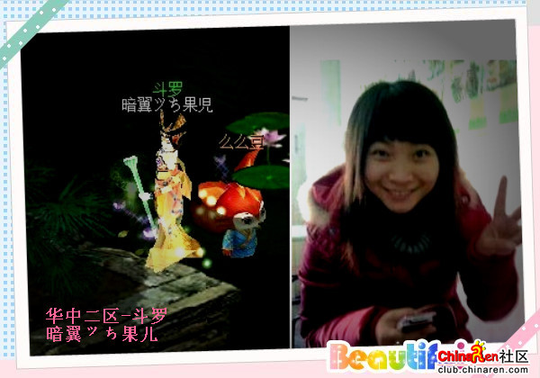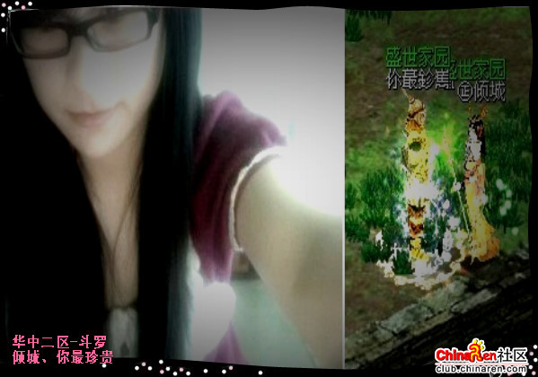 最近看到论坛里的仙MM们都出来晒照片、所以偶也忍不住咯、以下是部分姐妹的照片、请大家积下口德、骂声走远、非常感谢。(刀剑斗罗合区后,我们聚在一起,永远的姐妹。)下面先是LZ本人的照片、我来自华中二区-刀剑、角色名称-国色天香。下面是斗罗的、角色名称-夲宮ˇ冉児。(最可爱的、也是唯