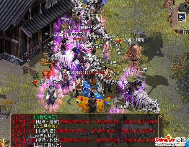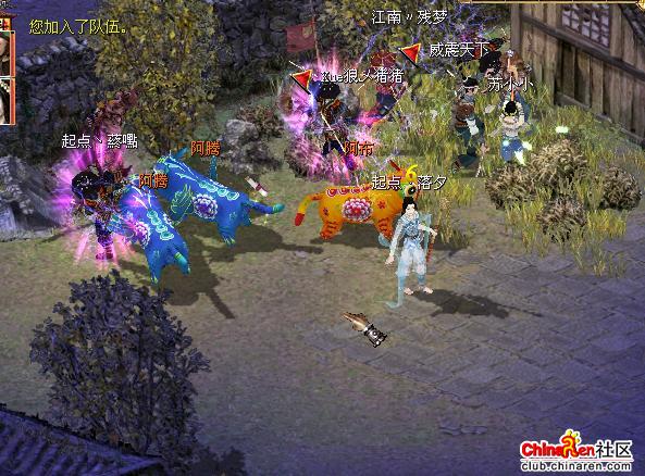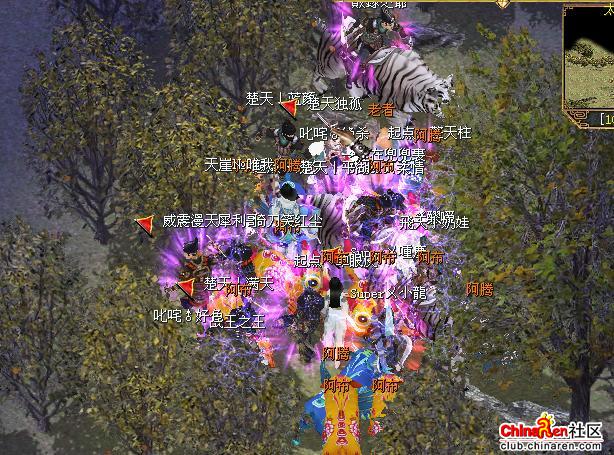 野猪林可是现在练级超快的喔,到10后,大部分老玩家,骨灰级别的玩家都会选择进野猪林咯。看到发光的人了么,那个是公会卡了啦。10以后领个包包就有了喔。光环漂亮了。