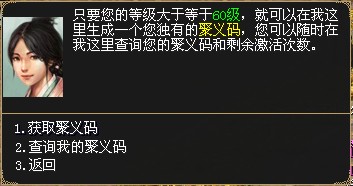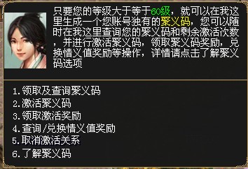 l 使用聚义码的玩家第一次结婚、第一次加入帮会、第一次拜师、转生都会给提供聚义码的玩家提供一定情义值。