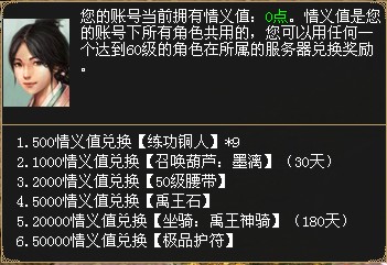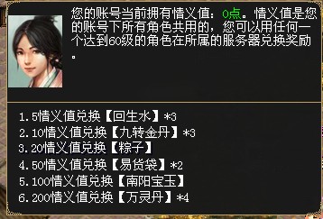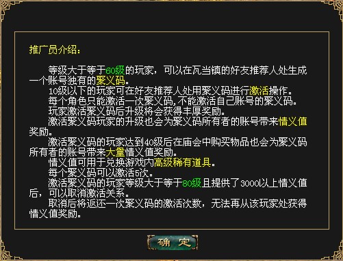 3、 新增推广员活动,等级大于等于60级的玩家上线可以收到信息提示,通过与瓦当镇NPC好友推荐人(91,80)对话领取聚义码,同一账号只能生成一次;低于10级的玩家可以使用好友的聚义码在瓦当镇NPC好友推荐人(91,80)处激活,每个角色只能激活一次聚义码。激活聚义码的玩家在达到10级、15级、20级、25级、30级、35级、40级、45级、50级、55级、60级、65级、70级、75级、80级时都可以在好友推荐人处领取相应奖励,每5次升级同时会给提供聚义码的玩家一定的情义值(情义值可以兑换奖励)。