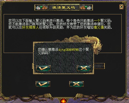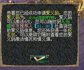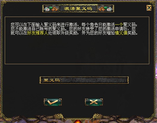 等级小于10级的玩家,才有资格激活聚义码,如下图弹出对话框后输入聚义码号,无误后确定。系统会自动提示发送成功。