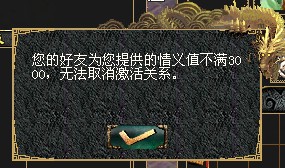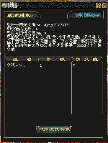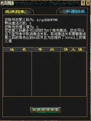 OK,一个聚义码的激活过程完成,这里恋恋需要重点说明的就是,聚义码激活后,申请激活玩家必须等级达到80级同事情义值达到3000。否则是不可以取消激活关系的,所以希望各位稻米一定注意,并注意阅读获取情义值的办法。