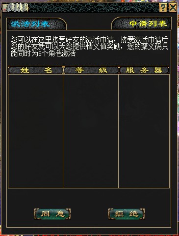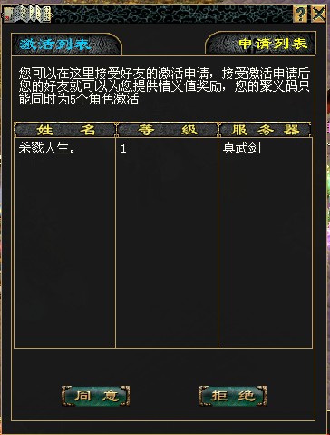 同时接受方“投名状”中申请列表里会显示如下图所示,可以单击申请激活玩家姓名确定后,申请激活聚义码玩家姓名会自动移动到激活列表中去。