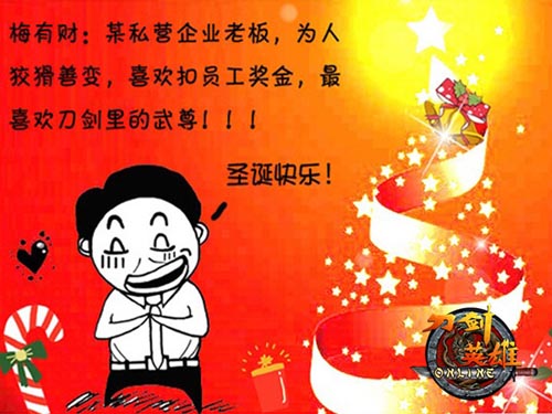 "梅有财"--某私营企业老板,故事中总是充当反面角色,为人狡猾善变,总是克扣手下员工"眼镜张"的奖金,不知道在新的故事里他能不能改掉自己的毛病。他在《刀剑英雄》中最喜欢的职业是武尊。
