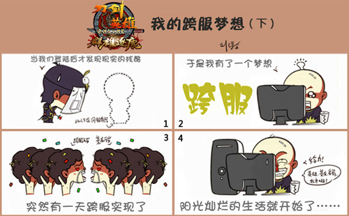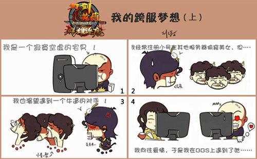 作者小传:苏寒寒(刘洋含),酷爱网络游戏,大学的专业也是学的3D动画,业余爱好自然就是网络游戏的同人手绘了。喜欢Q版风格,也喜欢恶搞,他的四格总是别出心裁,不仅画面清新,故事也十分有趣。这次《刀剑英雄》开启了跨服,引来玩家热议,《我的跨服梦想》这篇四格就此诞生,通过漫画告诉大家玩家是多么渴望跨服玩法。