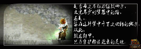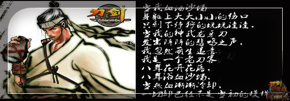 老刀客——献给刀剑英雄八周年曾记得,那一年我鲜衣怒马,告别我的青梅竹马开始浪迹天涯;曾记得,那一年我名扬九州功成名就,可是却已经找不到回家的路。当岁月的沧桑变成了我眼角镌刻的皱纹,寒来暑往时光随着我颚下的清须变长变远;当我追随着先辈们的足迹一步一步踏上楚天都的征程,故乡在我的脚下