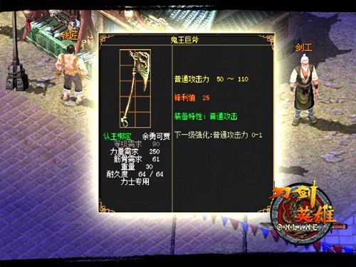 洛阳铸剑坊铁匠孙二是我最信赖的铸造师傅,据说他是剑工封炉后铸造技术最好的一个,这些原本都是传言,不过经我考证,其所铸造绿武锋利出的最早,约定等级爆吸血也最慷慨。为此,我将手中四把半成品深绿锤斧都交付给他进行升级,孙二前前后后也狠敲了我一些费用,对此我倒没什么怨言,只希望尽早升级完成,最好可以铸造几把绿武。在我的想法里,神武重洗属性随机已经破坏了我对极品绿武初始炼化的期待,不免勾起我隐藏在心中的另一种妖武情结,多年以前梦寐以求的妖族顶级蓝武——夜叉斧!