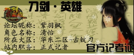通过【报道】寰宇天地独具浪漫——じ☆宇夜浪漫所在大区:华东二区凌云所在帮会:王者风云游戏昵称:じ☆宇夜浪漫(天帝V贝壳)初听到じ☆宇夜浪漫的名字,以为是雨夜浪漫,听其名判其人,这个名字很容易让人联想到夜幕雨中浪漫的场景,由此而判定他是一个浪漫多情的人。后来由于采访的需要,对于他的