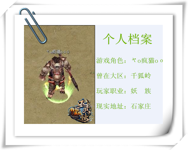 游戏角色:ヤo疯猫oοO曾在大区:千狐岭玩家职业:妖族现实地址:石家庄上榜理由:一个现实最忙碌的玩家,一个游戏最懒的玩家,经常出差走往各个城市,还不忘带着笔记本打开刀剑英雄。见过ヤo疯猫oοO这个名字的人,都会用傻猫来评价他,他为人直率,性格秉直,经常做出一些别人想不到的意外,然